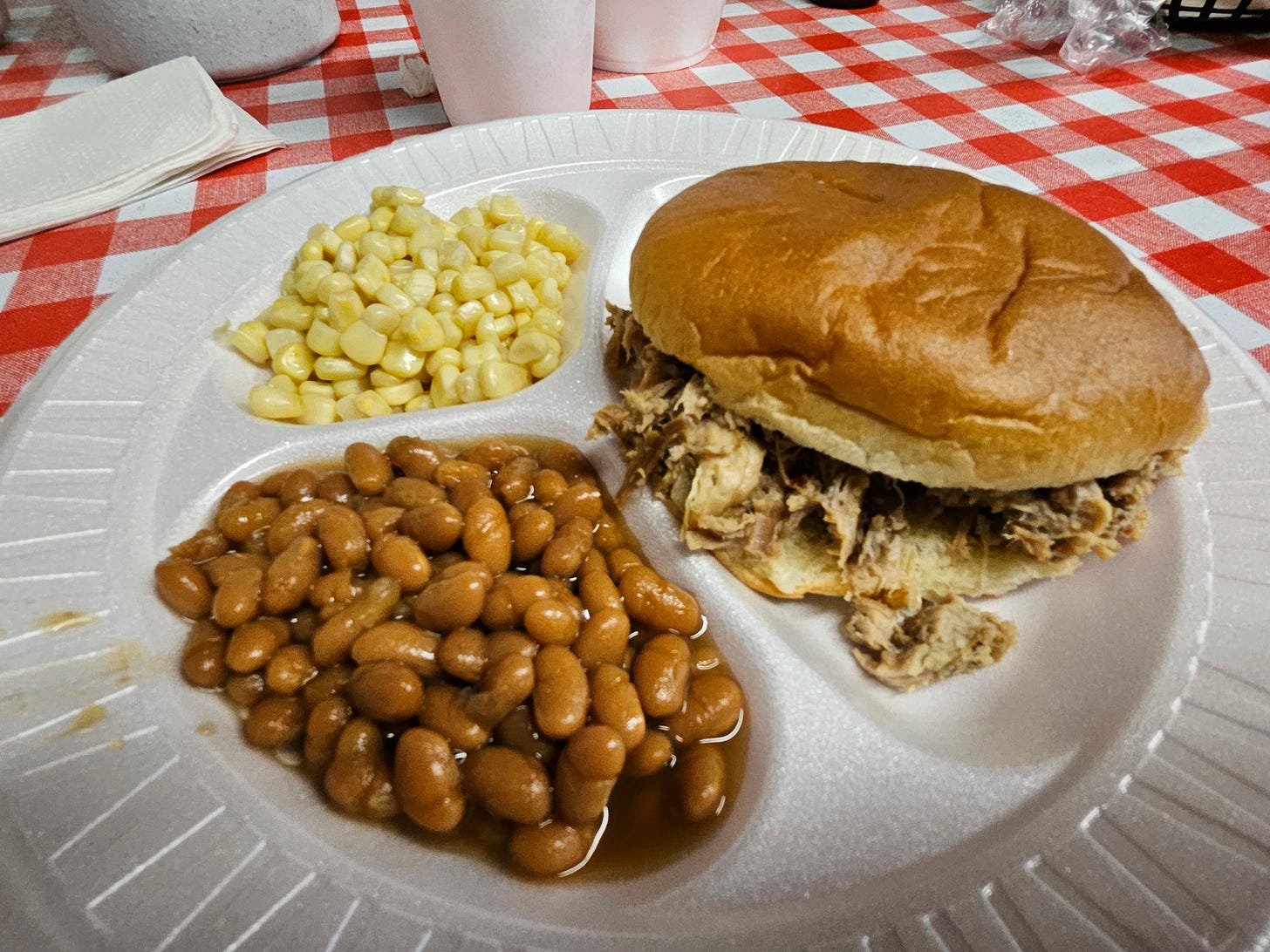 Given this, I had to force myself to even notice my meal. It was unassuming, frankly looking like cafeteria food, but I loved every bite: a tangy pulled pork sandwich, a side of fresh corn, richly flavored baked beans, and perfectly crispy hush puppies. I wish I’d had room for dessert, but I sadly had to say good-bye to Santa Claus and go on my way, very happy to have eaten at Stephenson’s.